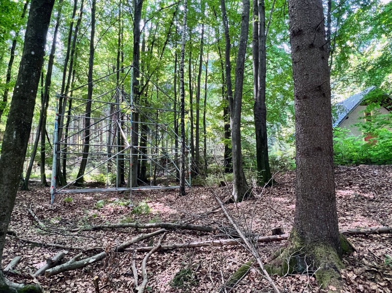 eine Installation aus Gerüststangen im Wald